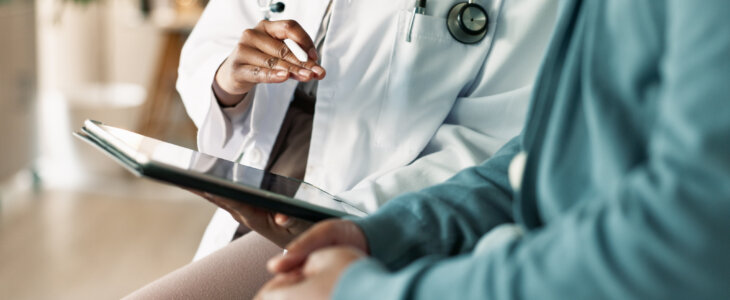 Tablet, hands and patient with doctor in hospital for consultation with cold, flu and sickness. Digital technology, conversation and person with healthcare worker for medical diagnosis in clinic.