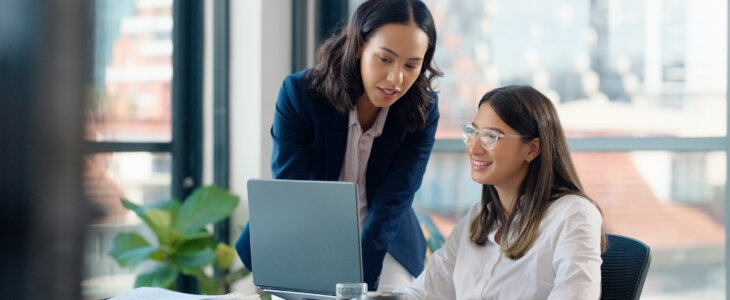 Business people, laptop or learning in training in discussion or conversation for news, education or advice. Teamwork, woman coaching or leader talking for online data or new job in digital agency